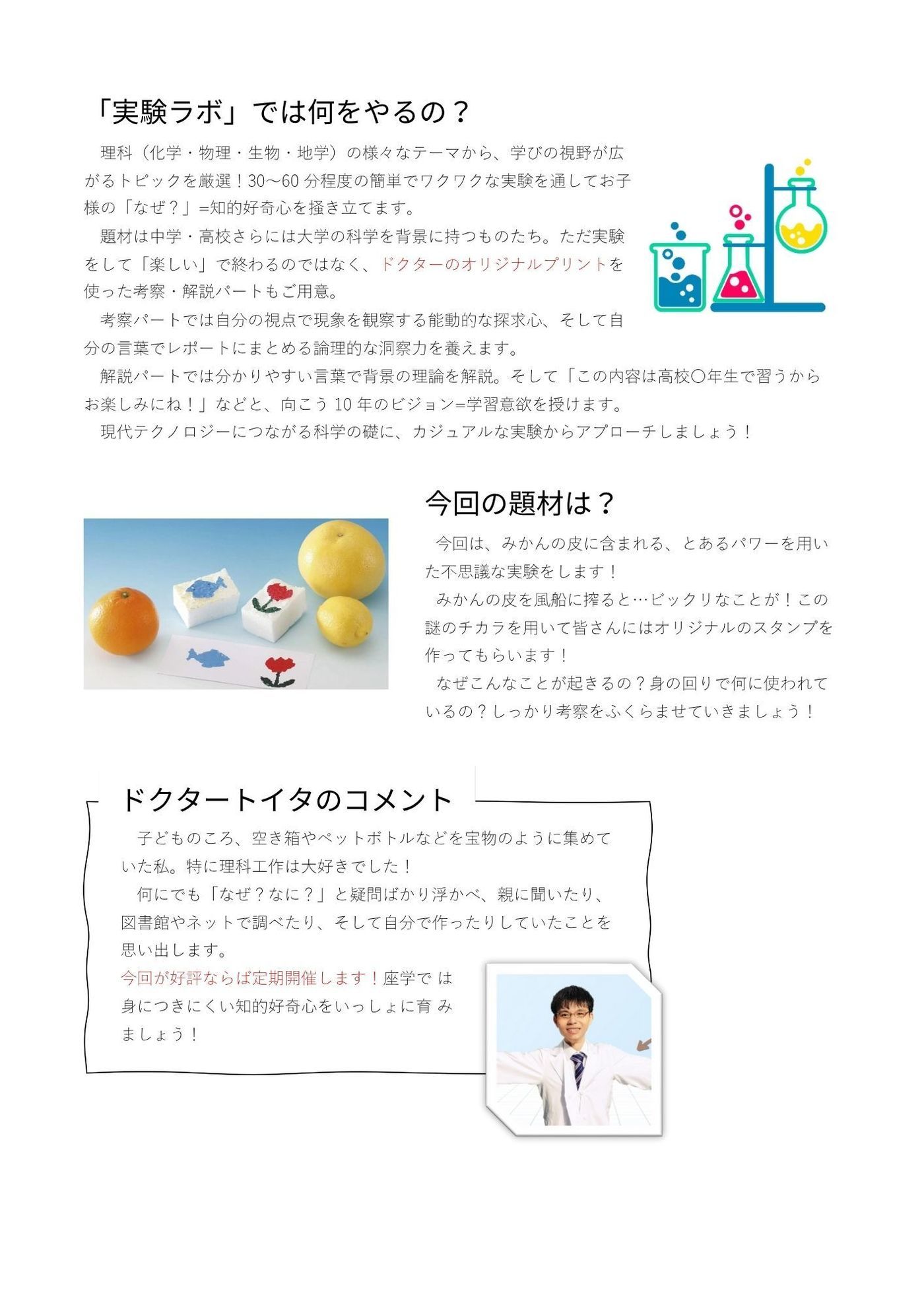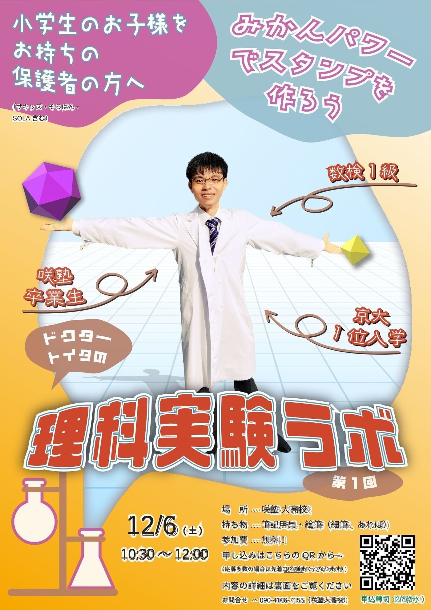 そういった興味の創造の場として、12/6(土)に小学生のイベント「ドクタートイタの理科実験ラボ」が開催されます